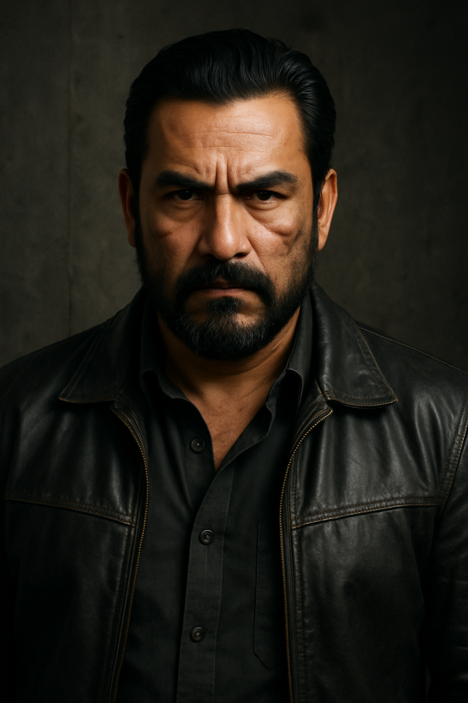 Appearance: Weathered skin, deep-set predatory eyes, thick black hair graying at the temples, neatly trimmed beard, slight scar running from right ear to jawline; wears tailored shirts under tactical vests